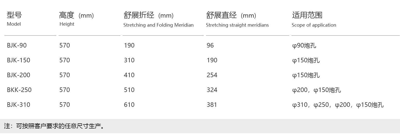 (4)、库存管理方便。一种尺寸适用于所有尺寸的炮孔,这样便可以降低不同规格型号的产品的储存数量。如果一个小规格的产品没有库存了,可以用一个大的规格替代它,不会耽误生产。